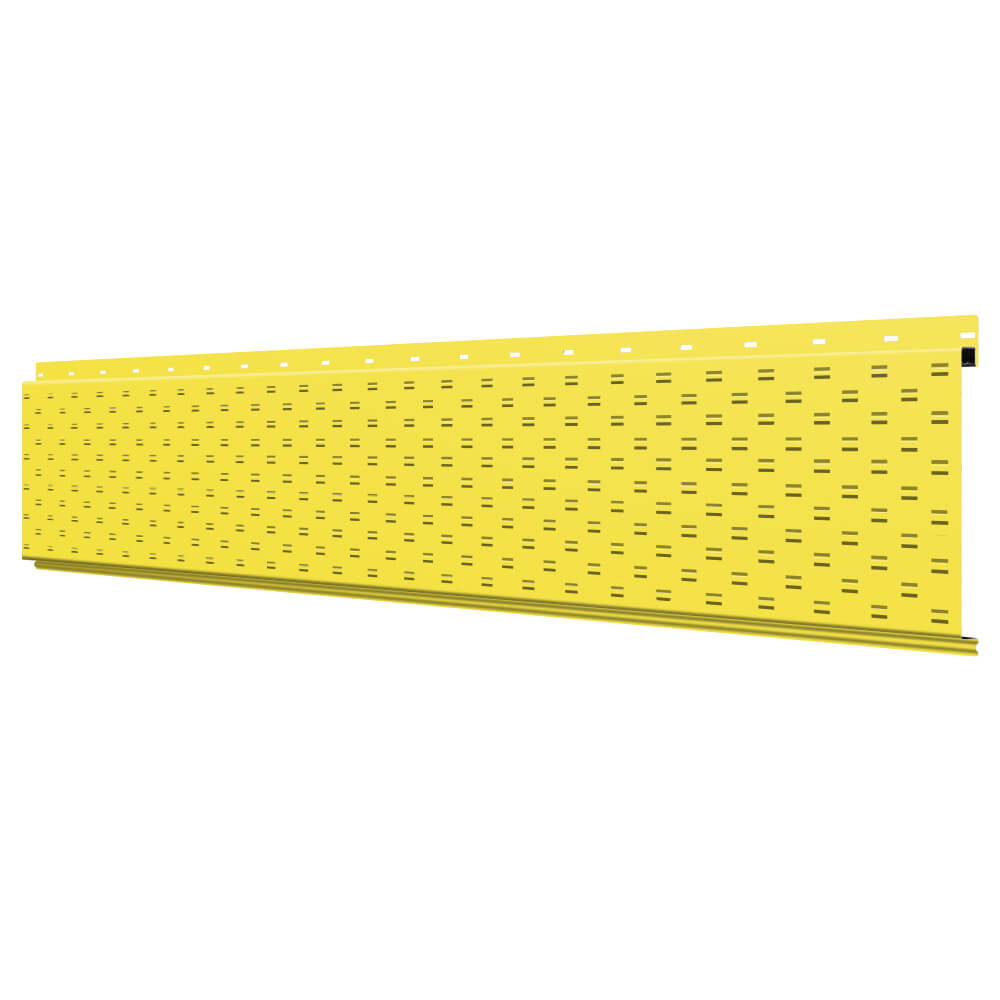 Линеарная потолочно-стеновая панель с ПЕРФОРАЦИЕЙ для вентиляции цвет RAL1018 Желтый применяется в качестве софитов для подшивы крыши, наружной и внутренней отделки потолков, стен, фронтонов фасада дома в Йошкар-Оле.
