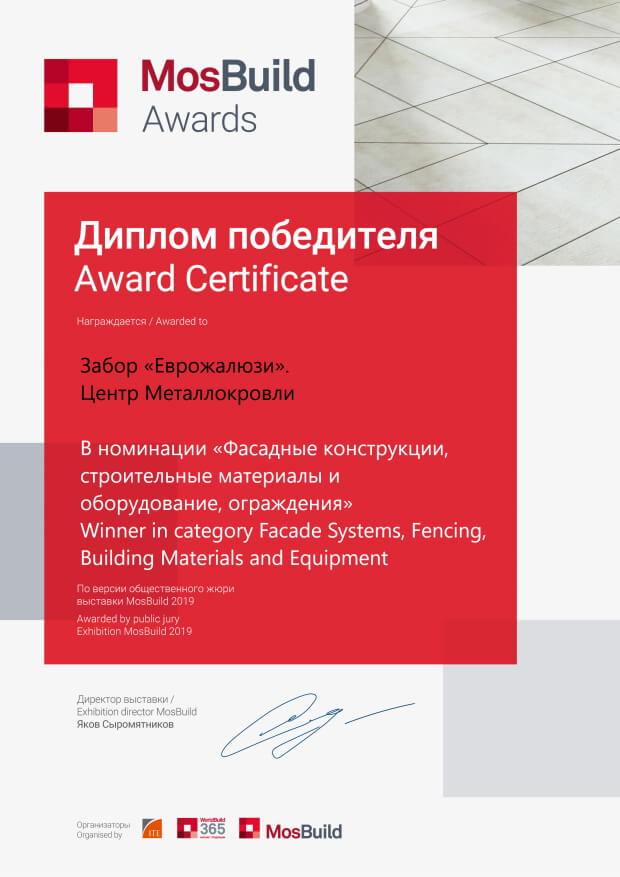 Металлические ламели «Еврожалюзи» для горизонтальных заборов-жалюзи стали победителями престижной премии MosBuild Awards / Новинки года 2019 в номинации "Строительные материалы, инструмент и крепеж" на международной выставке строительных и отделочных материалов Мосбилд 2019 WorldBuild Moscow / MosBuild Москва, Россия в результате голосования за лучший продукт - новинку года по версии общественного жюри!